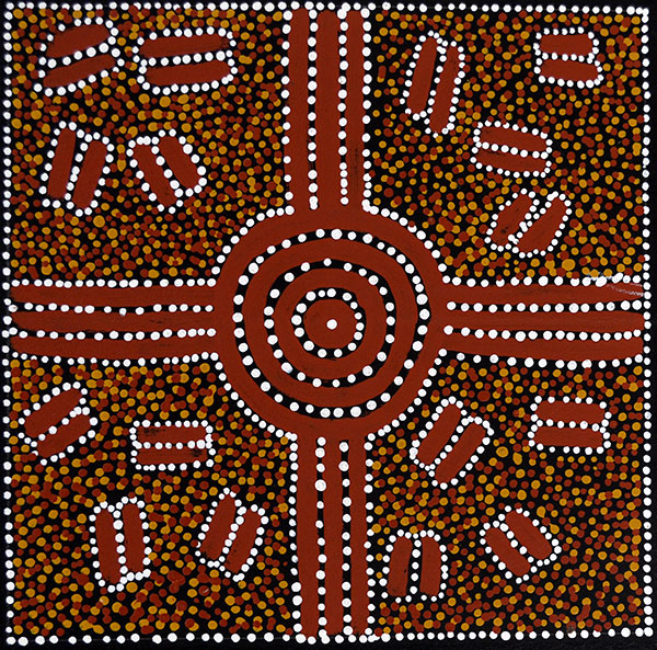 Benedy’s painting represents many of the design elements associated with the Tyankern – Mulga Seed Dreaming which belongs to his father’s country Ilkawerne located south of the Utopia region of Central Australia.